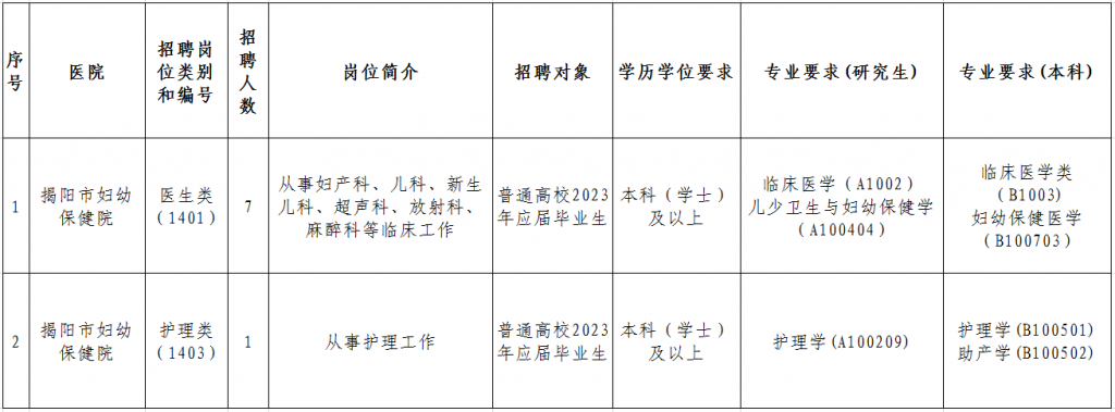 在揭阳市委市政府的大力支持下,揭阳市妇幼保健院住院综合大楼现已投入使用,为满足业务发展需求,我院将于2023年5月29日在南方医科大学(广州)、6月1日在广东医科大学(湛江校区)采取现场面试签约的形式,面向社会公开招聘8名工作人员。现将有关事项公告如下: